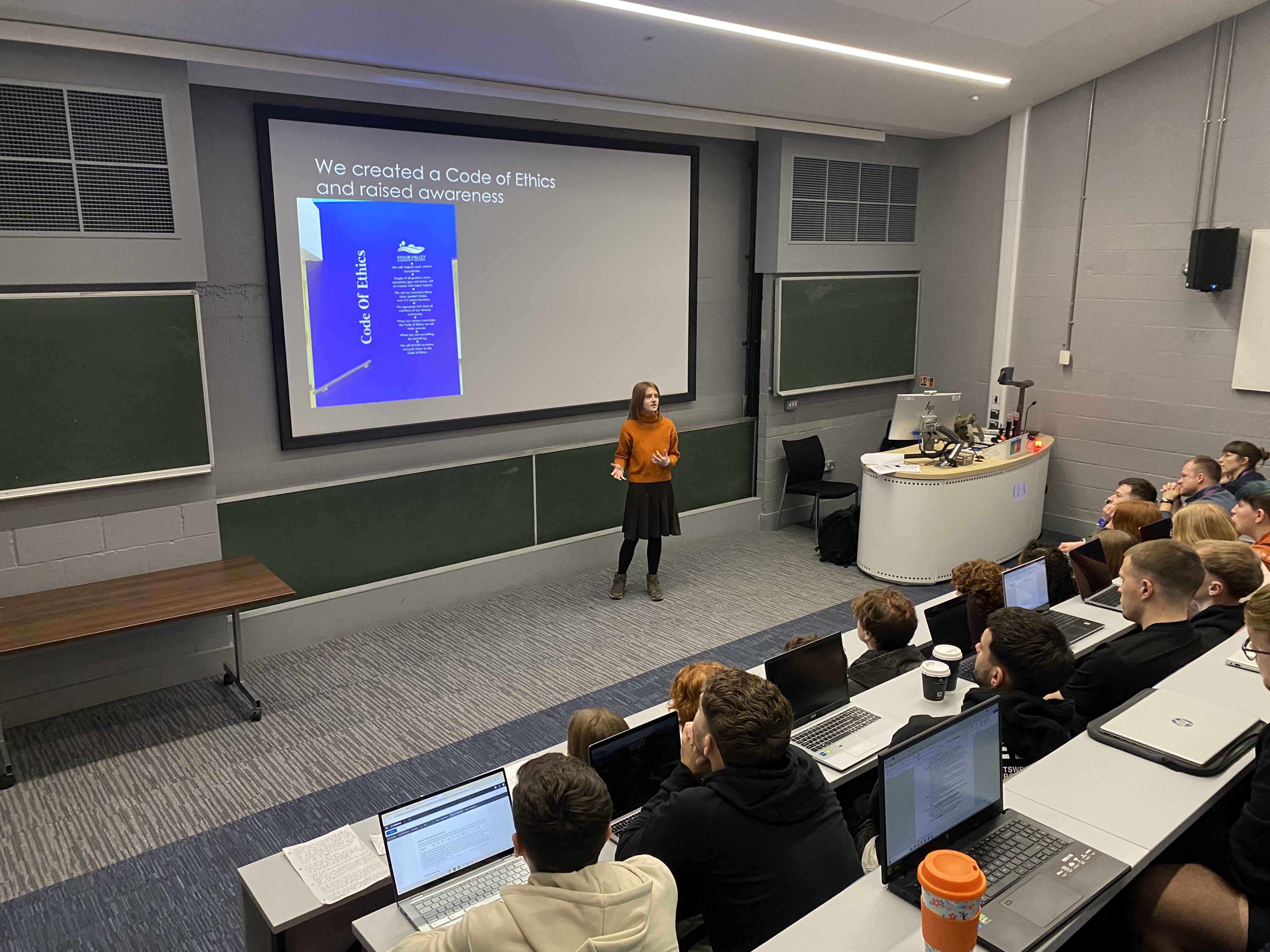 Miss Howard took the Ethics Committee and Peer Mentors to the University of East Anglia today. The Ethics Committee participated in a presentation to PGCE students about the Code of Ethics.